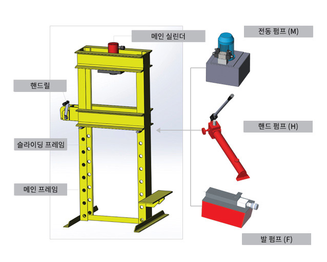당사 샵프레스는 메인 & 슬라이딩 프레임, 핸드릴, 메인 실린더로 구성되며 현장 여건에 따라 유압파워팩, 전동 펌프, 핸드 펌프 또는 발 펌프와 함게 작동합니다.